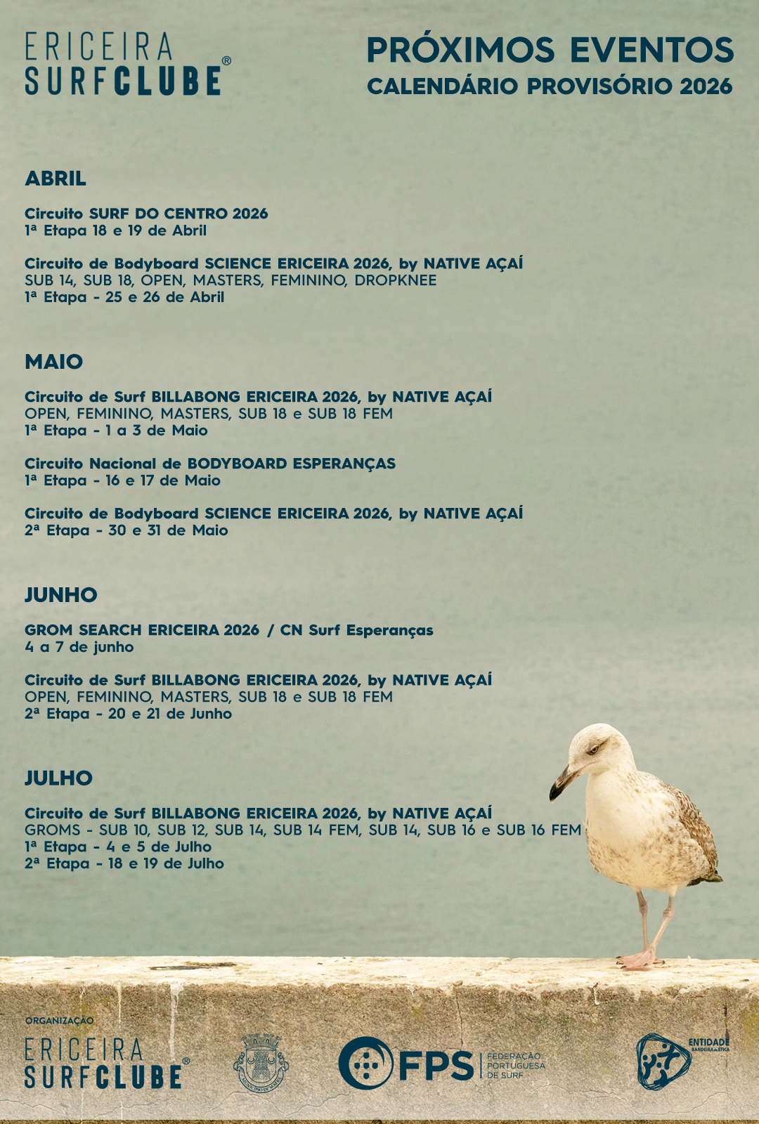 A época arranca no fim-de-semana de 18 e 19 de Abril, com a primeira etapa do Circuito Surf do Centro 2026. Logo na semana seguinte, a 25 e 26 de Abril, entra em ação o Circuito de Bodyboard Science Ericeira. O calendário pode ser visto aqui.