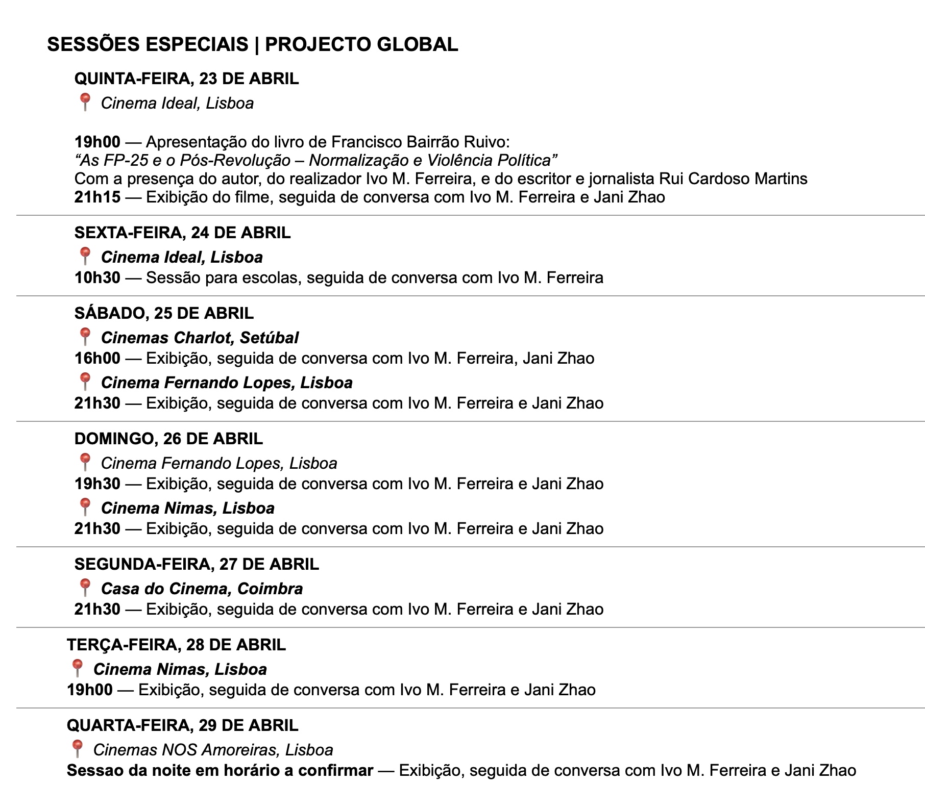 A primeira sessão está marcada para o dia da estreia, 23 de Abril, no Cinema Ideal, às 21:15, antecedida pela apresentação do livro ‘As FP-25 e o Pós-Revolução – Normalização e Violência Política’. A última será a 29 de Abril, nos cinemas NOS Amoreiras – pode ver a programação toda, aqui.